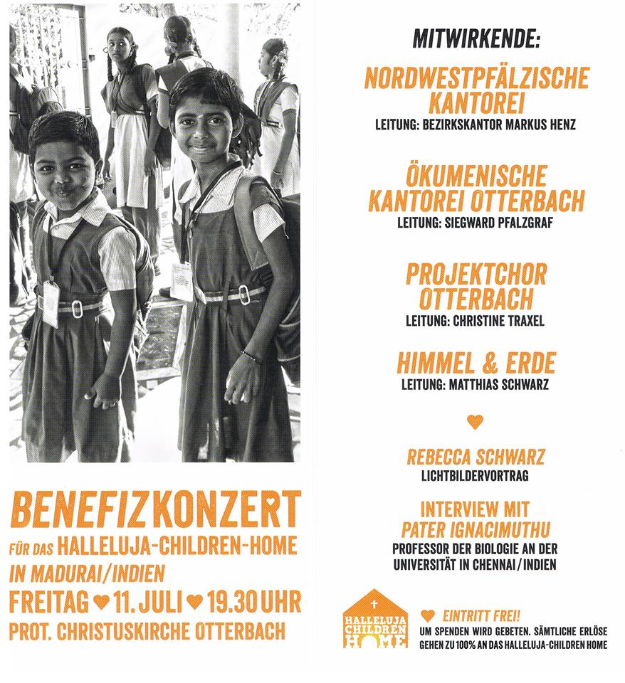 Am Donnerstag, den 22. Juni 2017, fand ein Benefizkonzert des ökumenischen Arbeitskreises Otterbach für das Halleluja Children Home in der kath. Kirche Mariä Himmelfahrt Otterbach mit Pater Ignaciumuthu statt.