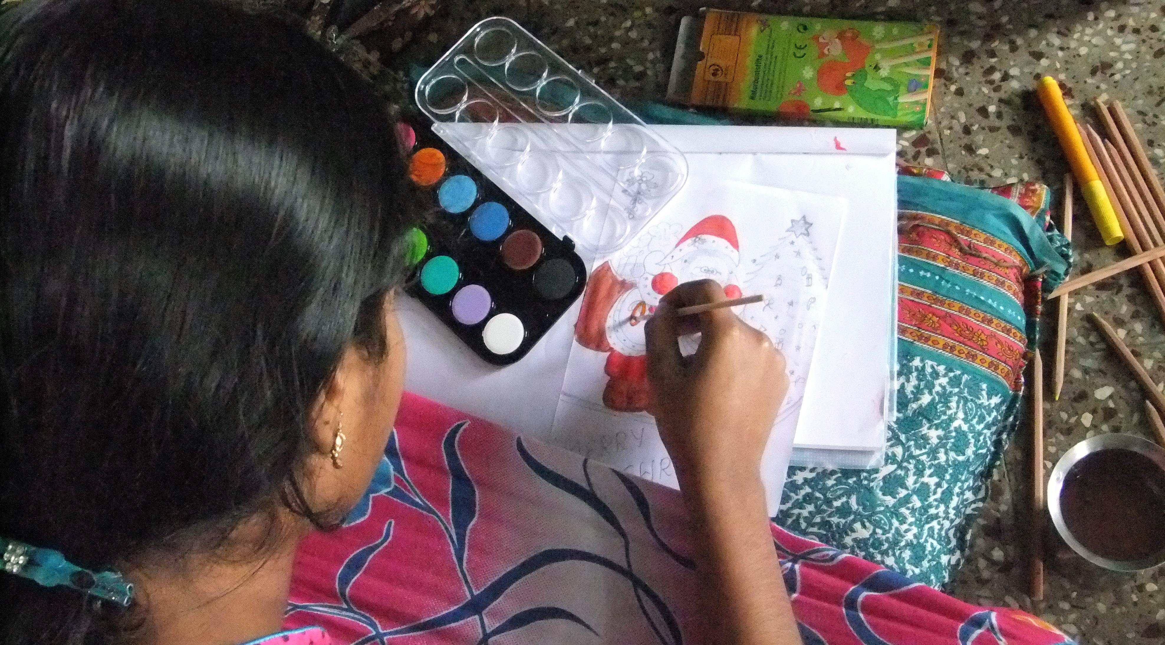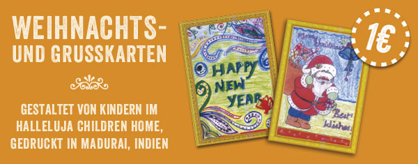 Die Mädchen aus dem Halleluja Children Home haben wie im letzten Jahr Grußkarten gestaltet. Wir haben sie in Indien gedruckt und gegen eine Spende hier verkauft. Der Erlös von 260 € kommt dem Kinderheim zugute!